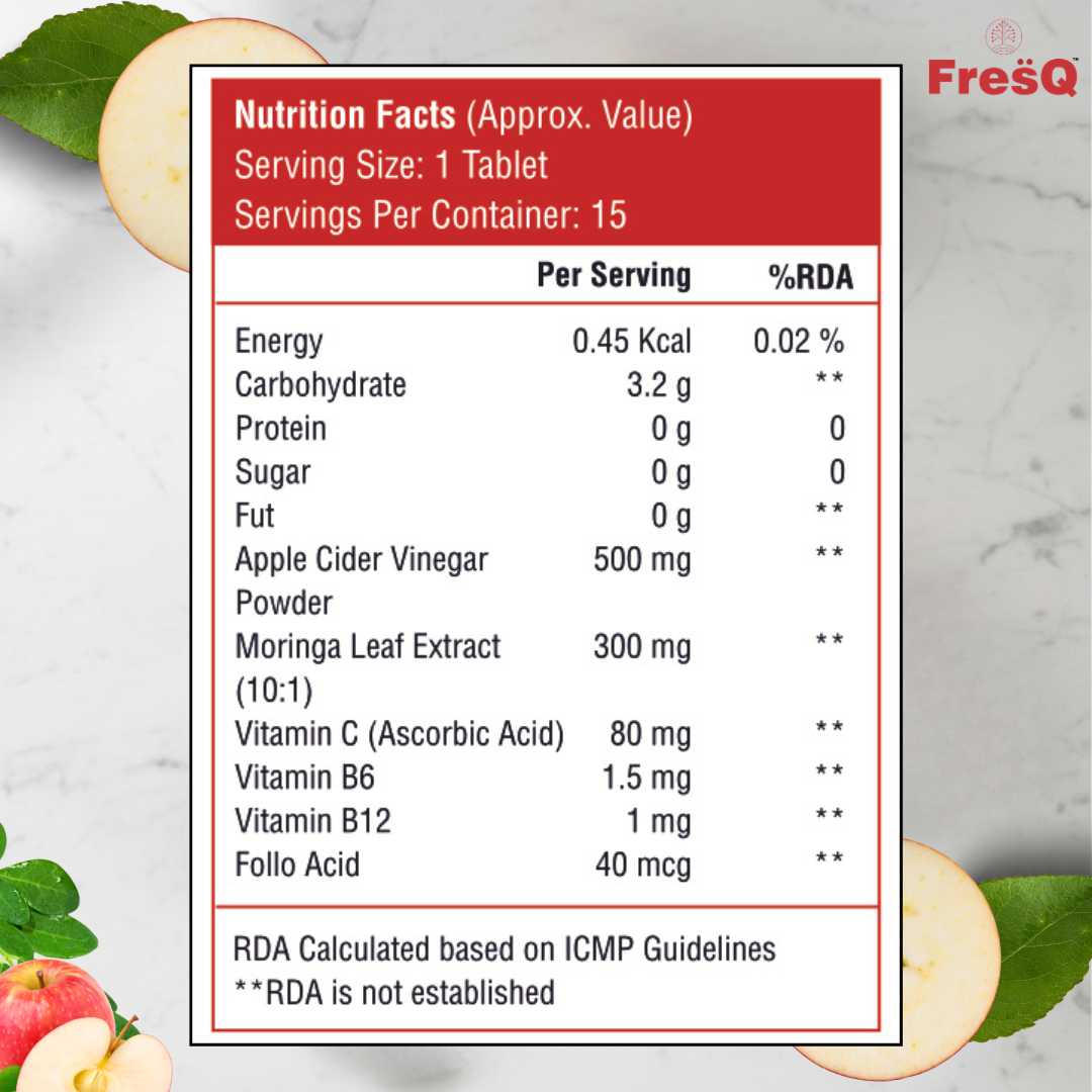 · Each tablet delivers the power of raw Apple Cider Vinegar with the goodness of Moringa — known as the “Miracle Leaf” for its antioxidant, detox, and metabolism-boosting benefits.